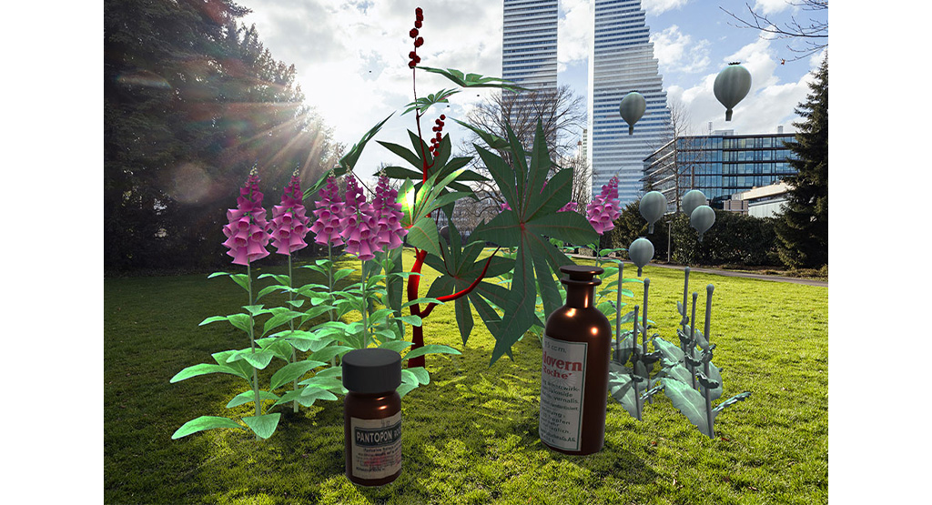 "Waldwandel/Forest Flux" (2023, with /p) is being shown as a mixed reality installation: visitors scan four 3 meter x 2 meter billboard images, arranged in Place des Hauts Fourneaux/Belval, to trigger a glade of trees in the space between. Part of "Hybrid Futures: Rhizomes, Meshworks and Alter-Ecologies" from