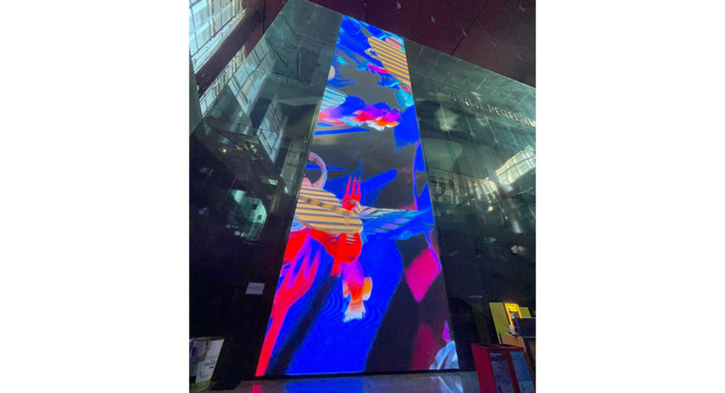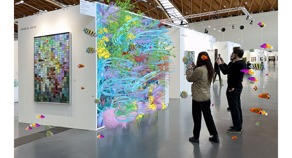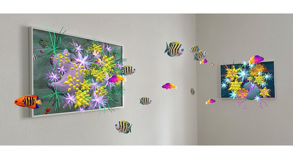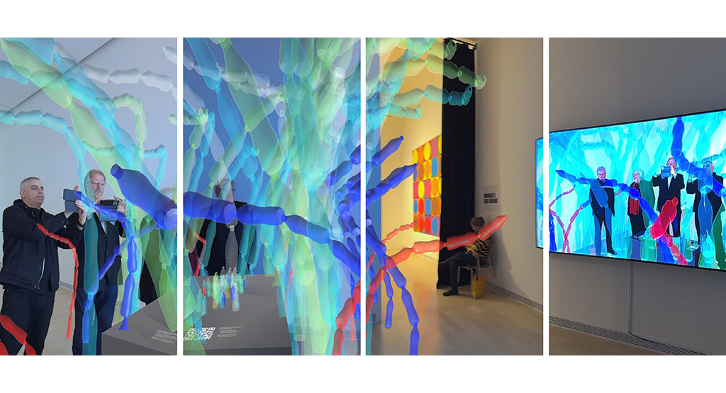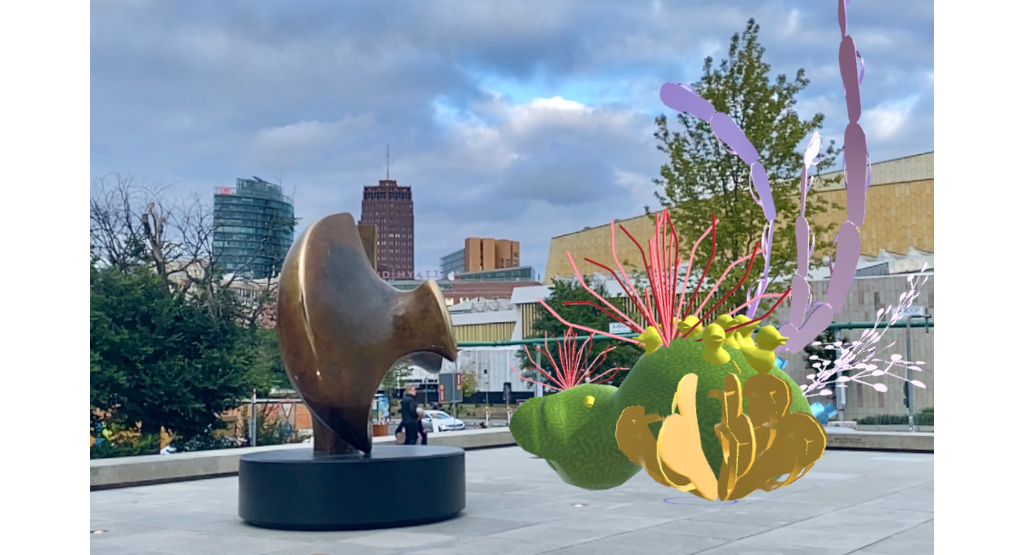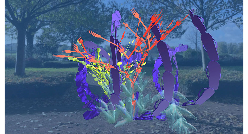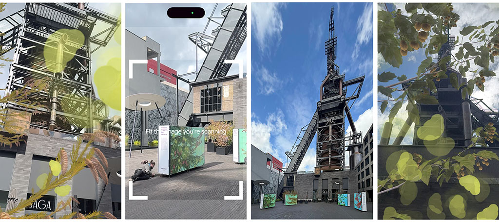"Waldwandel/Forest Flux" (2023, with /p) is being shown as a mixed reality installation: visitors scan four 3 meter x 2 meter billboard images, arranged in Place des Hauts Fourneaux/Belval, to trigger a glade of trees in the space between. Part of "Hybrid Futures: Rhizomes, Meshworks and Alter-Ecologies" from